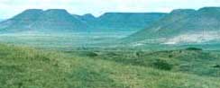 沿锡林浩特至张家口的公路南行,在30公里处可见到平顶山奇观。这里的群山相互依偎,大大小小排列有序,而顶部却刀削般的平整,构成一幅奇特的景致。