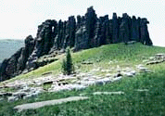 您一定到过云南、桂林,看过“路南石林”和“元谋土林”。今天您来到大兴安岭山脉的北大山上,请您一定要仔细看一看在海拔1600~1900米的花岗岩上的“阿斯哈图石林”(阿斯哈图汉译为险峻的岩石)。虽然都叫“石林”,可形成的原因却不同。云南的石林是石灰岩在热带气候条件下,经水流的溶蚀作用形成的。而大兴安岭最高峰附近的北大山一带发育的石林,主要是由冰盖冰川的创蚀、掘蚀和冰川融化时形成的大量冰川融水的冲蚀作用下产生的,所以叫“冰川石林”。石林通体为坚硬的花岗岩石,这是世界所罕见的。由于近水平裂隙特别发育,在石林侧面有保存较多的冰水冲刷形成的悬沟槽,远看恰似千层饼。石林顶部有冰臼分布,这是花岗岩地貌的新类型,在国内外尚属首次发现。