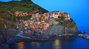 谷仰望山顶,云雾缭绕的小城若隐若现,恍如浮动的城堡,动感、梦幻的画面一一呈现眼前 ☆五渔村-散布在意大利海崖上的五渔村,保留原始的自然美,与世隔绝彷佛世外桃源,沿途壮丽陡峭的山崖,左边即是蔚蓝深邃的利古里亚海
