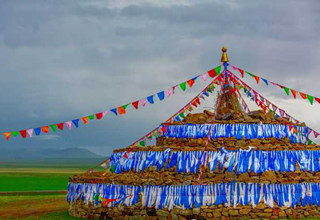 首先我们看到的是蒙元文化城的大门,在这里我卖一个关子,大家看一下像什么,有人说像童话城堡是吧,有人说像蒙古包,都不对其实呢来到我们草原,草原文化就是蒙元文化,我们的设计师独具匠心将蒙古族少女的头饰大胆的放大,上面点缀红色和绿色的珊瑚和松石,金色的蒙古族花纹作为装饰,使得我们远远的望去像是贡格尔草原天边向我们走来的蒙古族少女,或隐或现犹抱琵琶半遮面的感观,让我们对这里冲满无限的遐想。 进入大门迎面我们看到的是成吉思汗银碗喷泉广场,主要建筑一大两小银碗造型的喷泉,八根以蒙古传统文化的牛羊为主题内容的图腾柱。大家没来草原的时候就知道蒙古族人们大碗喝酒大碗吃肉,蒙古族招待客人喝酒用的都是银碗,蒙古银碗是用桦树根旋挖成型,再用银片包镶而成。银片与木碗严密合缝,密不容针。碗托錾刻精细,花纹多施以“八宝”图案。迎面的银碗喷泉酒香四溢预示着欢迎我们远道而来的客人, 继续往前走耸立在我们眼前的是苏力德,苏力德意为“长矛”、“旗帜”,是长生天赐予成吉思汗的神矛,是成吉思汗征战所向披靡权利的标志,也是蒙古民族象征着精神力量的吉祥物。苏力德位于中央,旗杆高15米,是目前赤峰范围内草原最高最大的苏力德!相传成吉思汗出生时手心里握的一块胎血就是此图形,所以蒙古民族世世代代以献哈达、神灯、全羊膜拜、圣酒、祭祀苏力德。每年阴历3月17日都会举行隆重的祭祀仪式,祭祀者虔诚地叩拜苏力德,借以表达对先祖成吉思汗的敬仰和缅怀。 过了苏力德迎面我们来到的是成吉思汗纪念堂,纪念堂两边排列着8个威猛的元朝大将,镇守着成吉思汗纪念堂,仿佛一下我们穿越回了元朝。纪念堂是由直径16米的蒙古包搭建而成,坐在蒙古包正中央高三米全身鎏金的就是元朝曾经争霸大半个亚洲的成吉思汗,蒙古族的民族英雄和精神领袖,分布在成吉思汗两边挂的是他的子孙三十六代帝王像,在这里你是否仿佛感受到了曾经千军万马一统河山的壮观场面,供桌上摆放着千盏酥油灯,日夜长明,祭奠一代天骄成吉思汗的英雄史诗,在这里你可以略表敬意点上一盏酥油灯,已是你对一代英雄的缅怀。 出了成吉思汗纪念堂我们现在走的石板路两边你会发现分布着无数的转经轮直通山顶的敖包。蒙古族信仰的宗教是萨满教和藏传佛教,到了元代藏传佛教在宫廷里取代了萨满教,成立蒙古族主要的宗教信仰,我们可以用你的双手去轻轻滚动转经轮感受一下神秘的藏传佛教,说话间我们到了路的顶端,耸立在我们眼前用巨石碟堆起来的就是敖包,你是否突然想起一首草原歌曲“敖包相会”是否想起了那个她(他)来到这里与您相会呢! 这里的敖包是由一大六小共计七个构成,中间这个对大的直径15米,高6米多,上边放有柳条,敖包周身挂满了哈达和经帆。蒙古族的祭祀,最隆重的当属祭敖包。早先蒙古族以为天地是人类赖以生存的源泉,特别加以崇拜。由于天地神没有偶像,人们就堆敖包以象征,从而敖包就成了人们的崇拜物。人们通过祭敖包祈求天地神保佑人间风调雨顺,牛羊兴旺,国泰民安。祭祀时,柳条上挂五颜六色的布条,旗上写经文。祭敖包的规模、形式多种多样。祭祀时,不论官吏还是平民一同进行礼仪活动。先请喇嘛烧香点火、诵经说文,大家围绕敖包从左向右走三圈并叩拜。礼仪结束后,举行欢宴。在高兴之余举行传统的赛马、射箭、摔跤和歌舞和盛大的那达慕活动。下面我们就跟随着喇嘛一起来一次入乡随俗祭敖包吧!感受一下这个神圣的仪式! 祭完敖包我们穿过前面的草原下边我们来体会一下草原牧民家的生活,感受一下草原生活文化。喝一喝奶茶、马奶酒、尝一尝奶豆腐、奶酪、牛肉干看一看草原工匠手工打造的马鞍子、马靴、桦木皮画、蒙古刺绣和蒙古地毯。在这里你可以真实的感受到蒙古民族的生活文化。 体验完牧民生活我们就可以坐下来欣赏那达慕歌舞摔跤马术表演了,坐在看台上放眼望去绿色的舞台和茫茫大草原、洁白的羊群、飞驰的骏马、蓝天、白云、跳舞的姑娘、骑马的小伙子儿自然的融合一体,仿佛自己置身于梦中草原。在这里你可以看到蒙古族姑娘婀娜多姿的舞蹈,可以看到马背男儿矫健的身手。